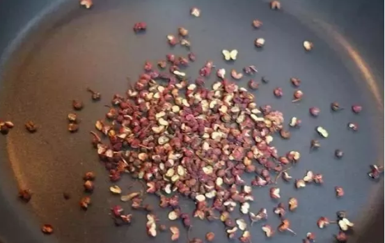 3、這時(shí)候可以制作麻醬餡料,先把花椒放入鍋里用小火煸炒熟。