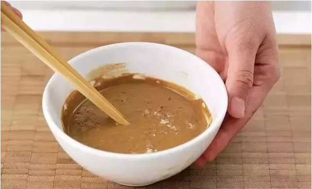 2、取芝麻醬盛不銹鋼小盆內(nèi),先分次加入500克清水,用筷子順一個(gè)方向攪拌成稠糊狀。然后,依次加入白糖、鹽、味精、桂林辣醬、蒜蓉和香油,充分?jǐn)嚢杈鶆颍帽ur膜封口,入冰箱保鮮,以便隨時(shí)取用。