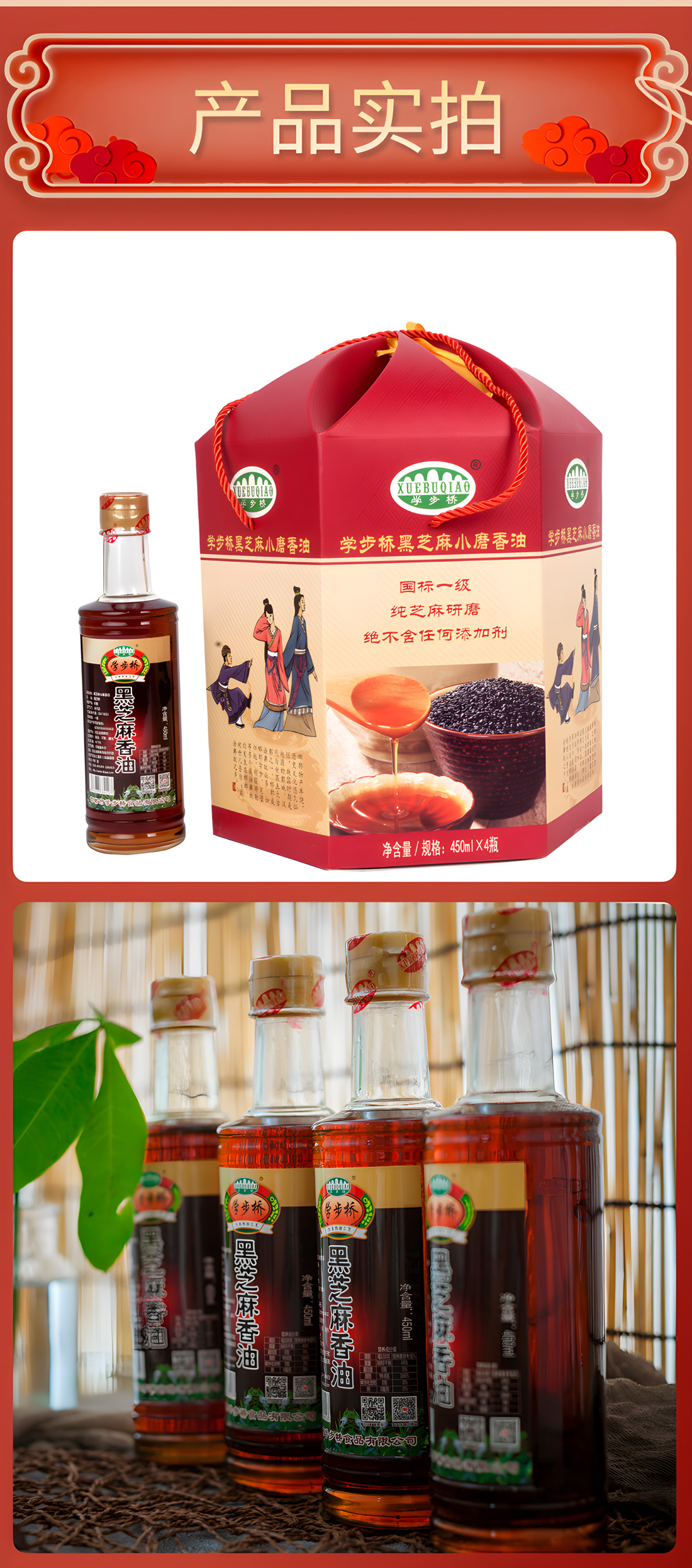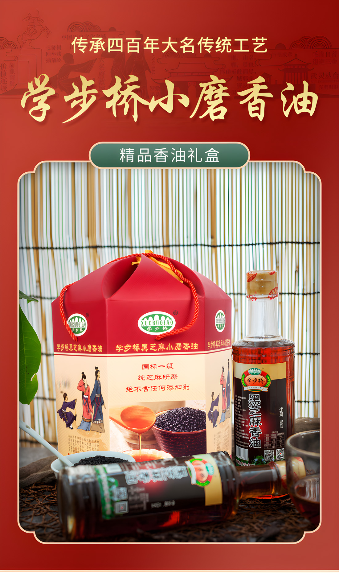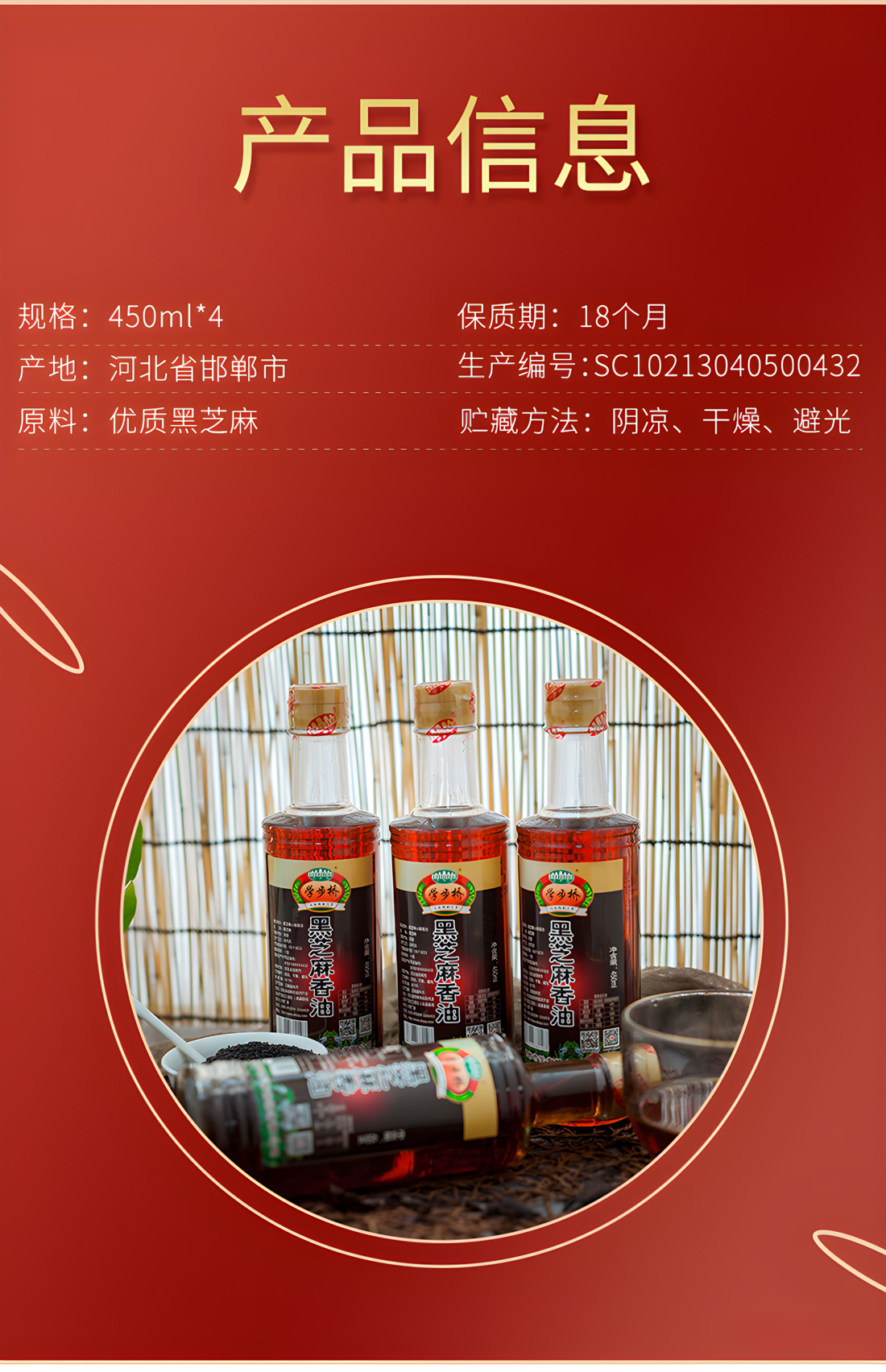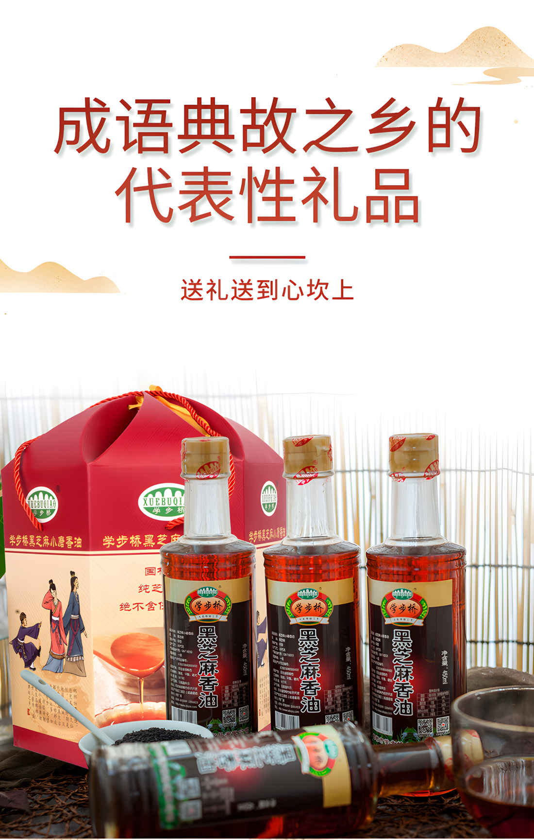 內(nèi)含450ml黑芝麻香油4瓶,此禮盒是所有香油禮盒量最多的一款,且性價(jià)比最高。禮盒外觀為六楞型,更顯精致獨(dú)特。六楞盒六面插畫介紹了邯鄲文化、制作工藝等內(nèi)容,使禮盒貴而不俗,是送領(lǐng)導(dǎo)、老師、長輩、親朋好友,彰顯尊貴的伴手禮。