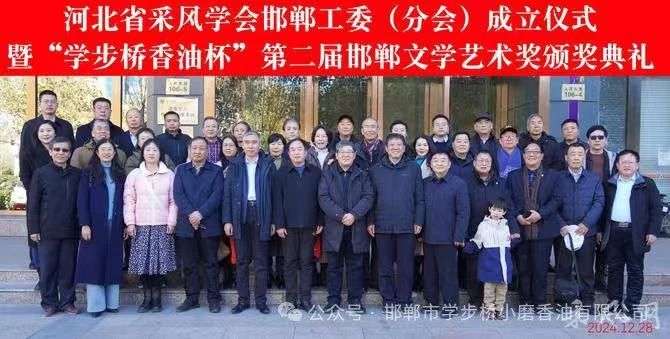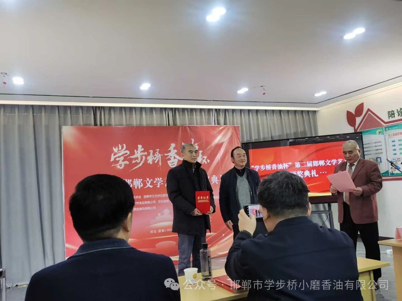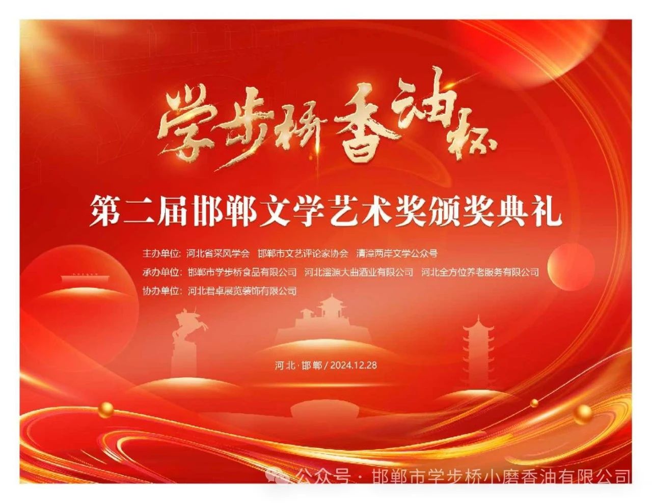 在2024年12月28日這個陽光灑滿大地的上午,一場備受矚目的文化盛宴 — 由學(xué)步橋小磨香油有限公司贊助的第二屆 “學(xué)步橋香油杯” 邯鄲文學(xué)藝術(shù)獎頒獎典禮隆重舉行?,F(xiàn)場匯聚了全市 50 余名文學(xué)藝術(shù)名家、文藝愛好者以及各方代表,他們帶著對文藝的熱愛與期待,共同見證了這一榮耀時刻。